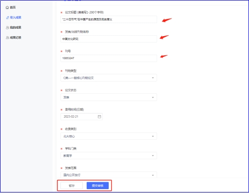 以“发表论文成果”为例,按系统要求填报对应发表内容即可。填报完成后可选择“暂存”或“提交审核”。