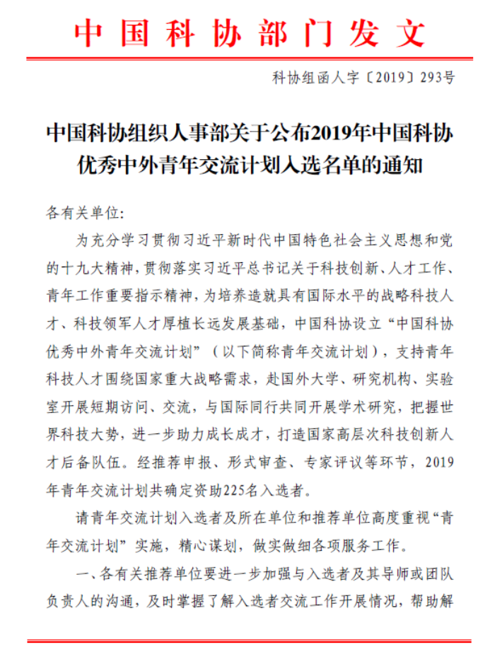 近日,中国科协公布了“2019年中国科协优秀中外青年交流计划入选名单”。今年会张万里副教授成功入选。