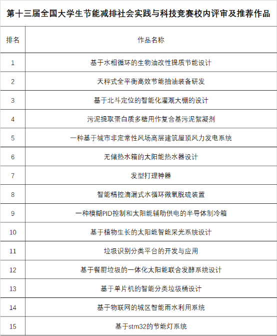 经专家现场打分和综合评审,共遴选产生15项作品代表学校参加全国大学生节能减排竞赛活动(名单附后)。
