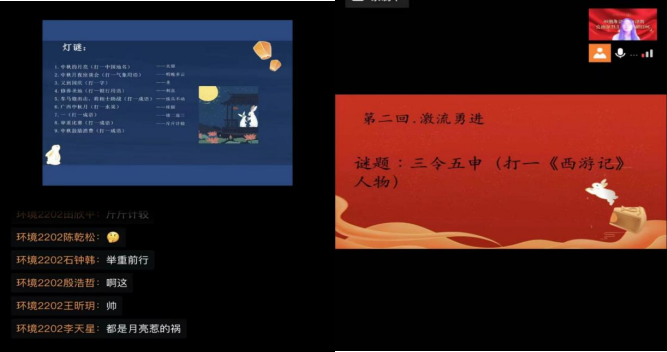 2022级的新生助导们还特意设计了“中秋猜灯谜”的小游戏环节,助导们认真准备、积极参与、搜集了有关中秋节的节日起源、传统民俗、逸闻趣事、诗词佳句的灯谜,为同学们呈现出一道道传统文化的知识盛宴,拉近了彼此的距离。