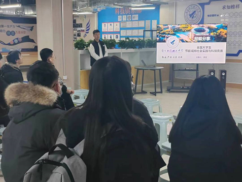 孙文同学首先分享自己参加第十五届、第十六届全国大学生节能减排社会实践与科技竞赛,第五届全国大学生可再生能源优秀科技作品竞赛的参赛经历和所取得的成绩。孙文同学通过总结历年竞赛获奖作品类型,详尽分析了社会实践类作品与科技发明类作品的特征及获奖情况,帮助各位同学认清选题方向。他鼓励同学们通过查阅文献、请教学长学姐、与同学头脑风暴以及学习国内外竞赛作品等方式开阔视野,发散思维,他同时分别从第十五全国大学生节能减排社会实践与科技竞赛中挑选出获特等奖的社会实践类和科技发明类作品做为解读案例,从作品说明书书写,申报书填写,视频制作,宣传图设计等四个方面对获奖作品逐项讲解,深度剖析作品的创新亮点和可学习之处。孙文同学结合自身经历按照组队,联系导师,拟定选题,说明书设计到答辩PPT制作的五个步骤,将自身遇到的阻碍以及解决办法真实的呈现在同学们面前。分享会结束后,他为同学们一一解答疑惑。