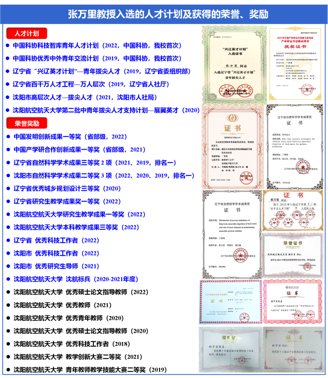张万里老师将“德能并进,勇毅翔远”的校训牢记心头,投身于钟爱的科研事业。面向节能环保和新能源战略性新兴产业发展需求及双碳目标,开展有机固废能源化方面的研究。主持纵向科研项目14项,含国家级3项、省部级6项、厅局级3项,纵向经费302万。第一作者发表SCI论文10篇,含中科院一区TOP论文8篇,一作论文总影响因子104.114,篇均10.41。入选中国科协优秀中外青年交流计划(2019,我校首次)、中国科协科技智库青年人才计划(2022,我校首次)、辽宁省兴辽英才计划—青年拔尖人才(2019)、辽宁省百千万人才工程—万人层次(2019)、沈阳市高层次人才—拔尖人才(2021)、沈航展翼英才(2020)等多项人才计划。荣获辽宁省优秀科技工作者(2022)、沈阳市优秀科技工作者(2022)、沈阳市优秀研究生导师(2021)、沈航标兵(2020-2021年度)、校优秀教师(2021)、优秀青年教师(2020)、优秀硕士论文指导教师(2022、2020两次)、优秀科技工作者(2018)等多项荣誉。