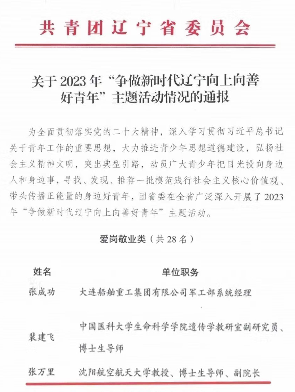 喜报|今年会张万里教授荣获2023年“辽宁向上向善好青年”称号
